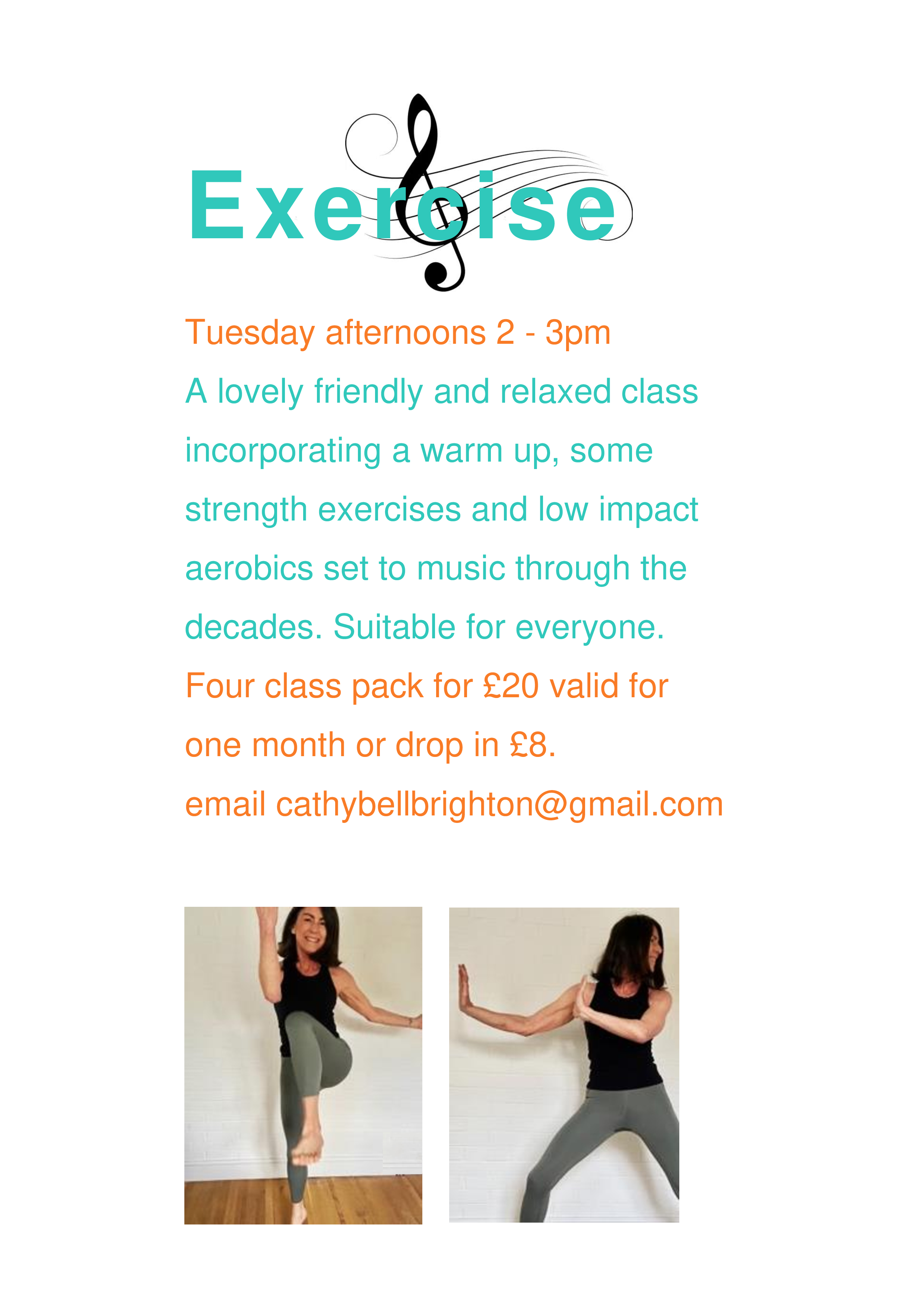 Exercise to Music (all ages) – Cathy, cathybellbrighton@gmail.com Tue: 2.00pm-3.00pm drop-in, £8 or £20 for 4 classes, valid for one month.