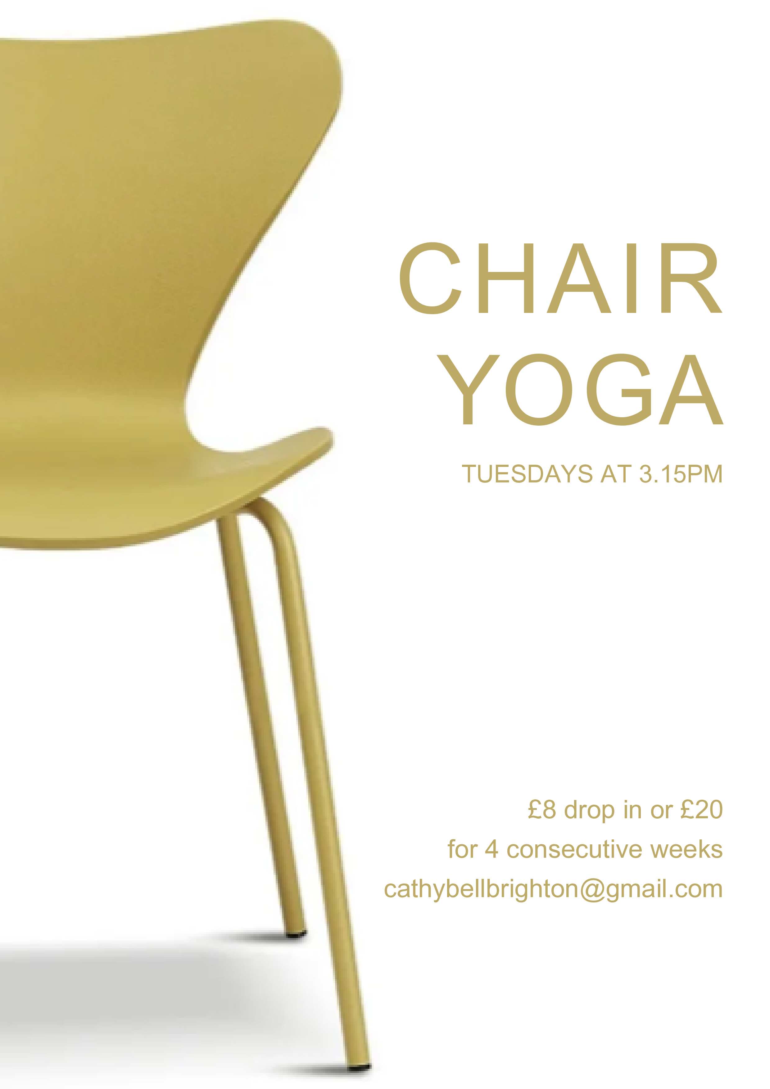 Chair Yoga (all ages) – Cathy, cathybellbrighton@gmail.com – Tue: 3.15pm, drop-in, £8 or £20 for 4 consecutive classes.